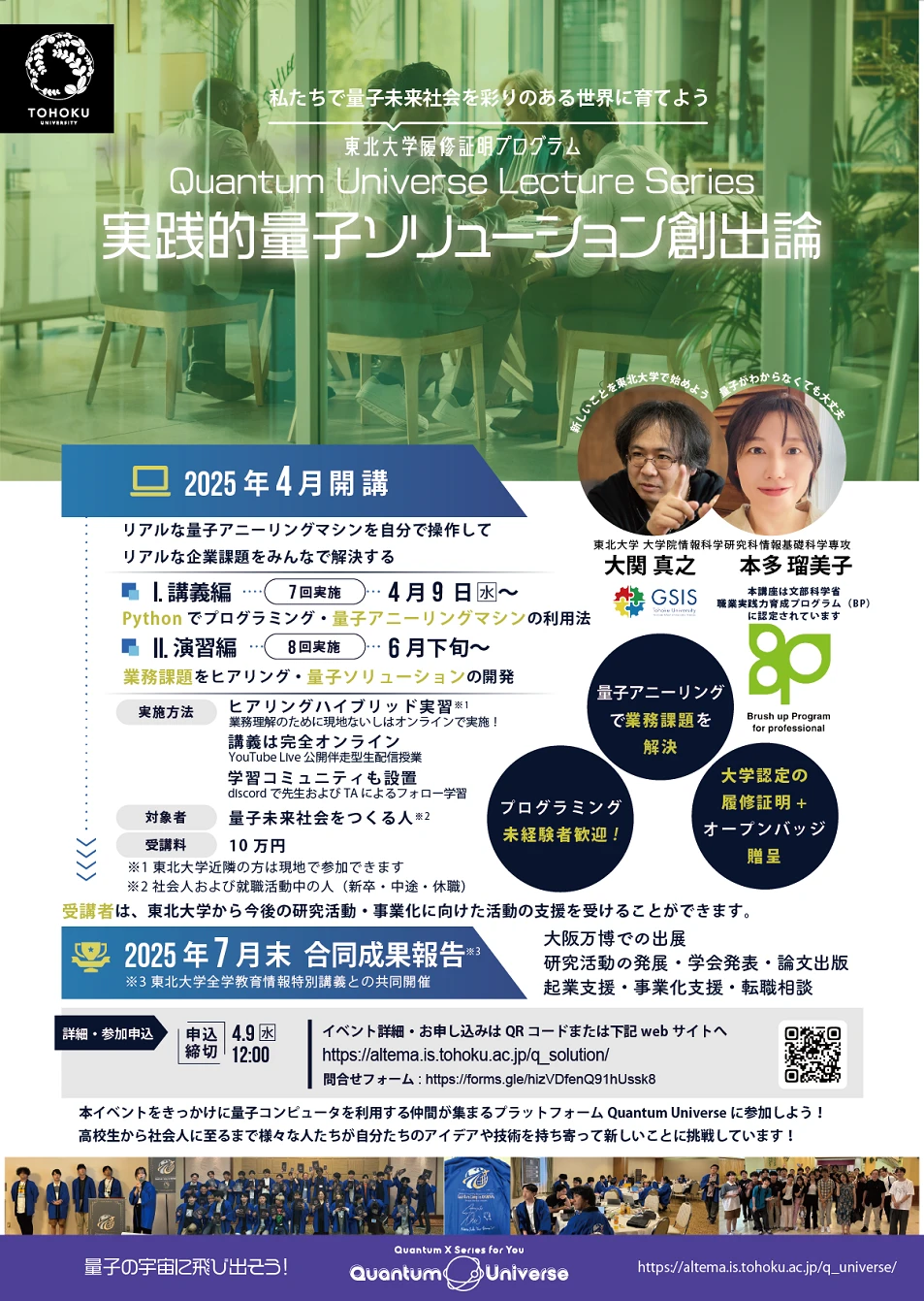 社会人を含む幅広い層が履修できる公開講座として設計。遠隔地からもアクセスしやすいオンライン主体の構成でありながら、対面相談会やハイブリッド開催を組み合わせて実践的な学びを提供します。量子アニーリングによる解法設計と 企業課題をベースにしたソリューション創出を同時に体験できる点が特徴です。